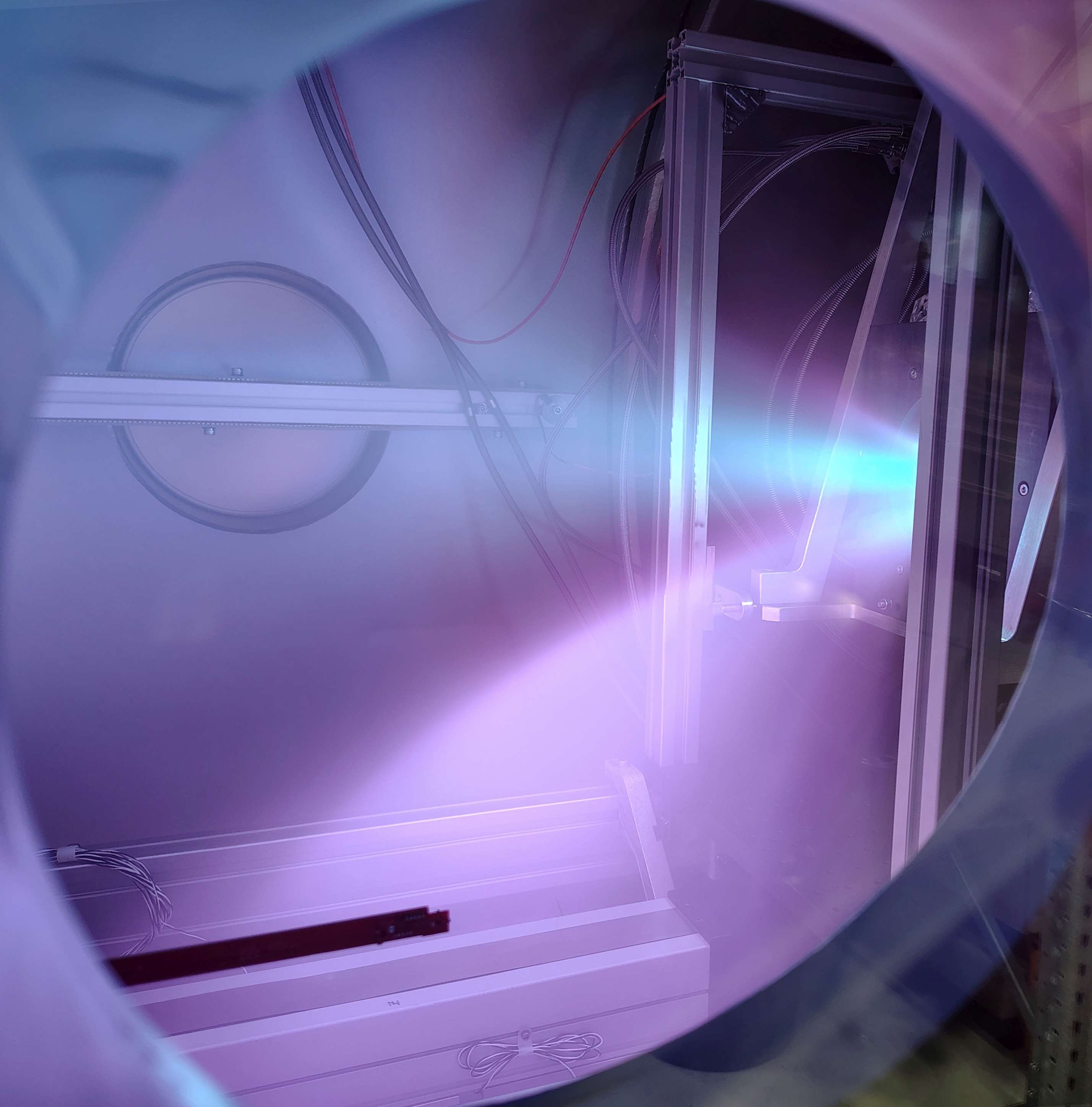 Figure: Kōkako thruster under test in Paihau—Robinson vacuum chamber, which simulates the vacuum of space. The thruster is mounted on a fixture which collects very precise measurements of thrust to characterise the thruster over a range of operating conditions. Credit: Emile Webster