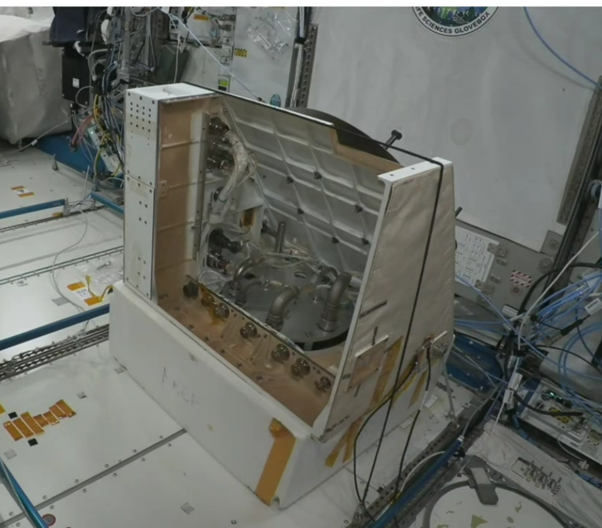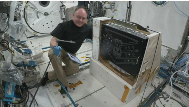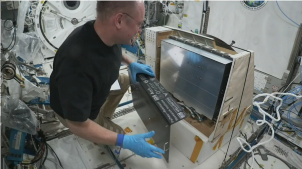 Image: astronaut installing Hēki in NREP. In addition to “housing” Hēki, the NREP provides a power and data interface between Hēki and the ISS. Entrance to JEM airlock is visible in the background. Credit: NASA